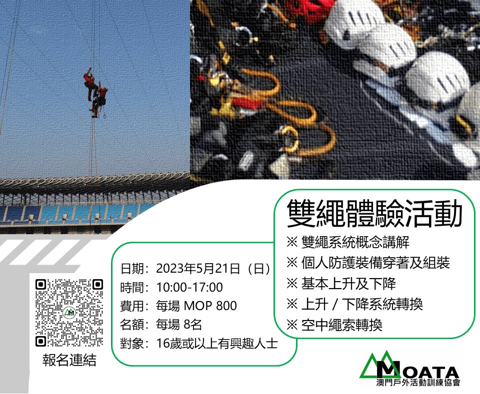 活動報名 《雙繩體驗活動 2023-5》 分類: moatahomeless 於 2023-03-252023-03-25 主辦:澳門戶外活動訓練協會 日期:5月21日(日) 時間:10:00 – 17:00 對象:16歲或以上有興趣人士(18歲以下參加者需要簽署「家長同意書」) 名額:上限8人(4人成行),報名及繳費後收到確認電郵即為報名成功,先報先得。 費用:MOP 800 地點:路環 報名連結 註: 是次活動將購買保險,請按身份證填寫資料,資料不全者將無法為您購買保險,亦不能參與是次活動 收到報名表後將會以電郵通知付款事宜,請適時查閱電郵 分享此文: 按一下即可分享至 X(在新視窗中開啟) X 按一下以分享至 Facebook(在新視窗中開啟) Facebook 點這裡列印(在新視窗中開啟) 列印 分享到 WhatsApp(在新視窗中開啟) WhatsApp 喜歡 正在載入... 相關